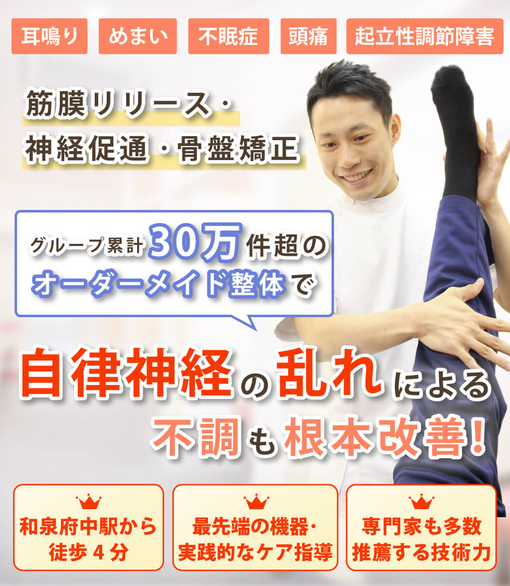 自律神経失調症、耳鳴り、めまい、不眠症、頭痛、腰痛などの自律神経の乱れからくる身体の不調の施術経験が豊富な整体院です。施術して終わりではなく、その後の自宅でできるセルフストレッチや生活習慣の指導もいたします。